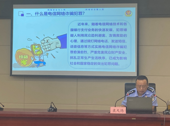 漯河市公安局刑警支队打击侵财犯罪大队大队长袁天赐,围绕“什么是电信网络诈骗犯罪”、“为什么电信网络诈骗犯罪高发”、“我们为什么会上当”、“电信网络诈骗犯罪手法解析”、“我们该怎么做”等五个方面,结合实际办理的案件,深刻剖析了电信网络诈骗48种犯罪手法中常见的刷单诈骗、网贷诈骗、网购诈骗、“杀猪盘”诈骗等9种高发高频诈骗方式,普及了防范电信诈骗“三字经”(多分析、多询问、96110)和“四个不”,切实保护好个人信息安全。