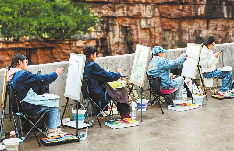 秋日的林州太行大峡谷,层林尽染,丹霞赤壁与斑斓树影交相辉映,勾勒出一幅天然的山水画卷。11月1日,来自全国各地的美术学子,在这里开启了一场沉浸式的写生之旅。记者 邓放 摄