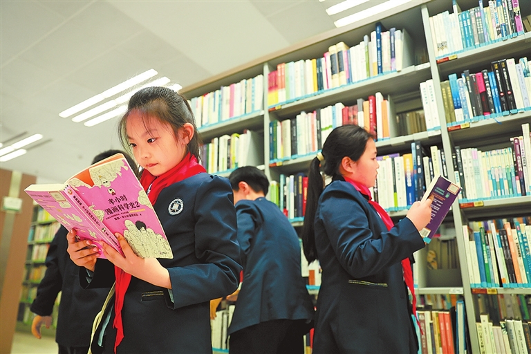4月20日,世界读书日前夕,郑州市郑东新区康平小学三年级全体师生走进郑州图书馆,开展读书日主题实践活动。图为孩子们在书香中静心阅读。记者 聂冬晗 摄