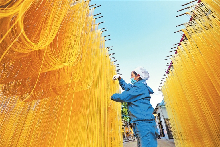 光山县十里镇高大店村村民在制作晾晒传统手工油条挂面